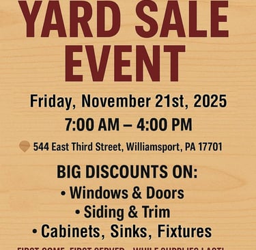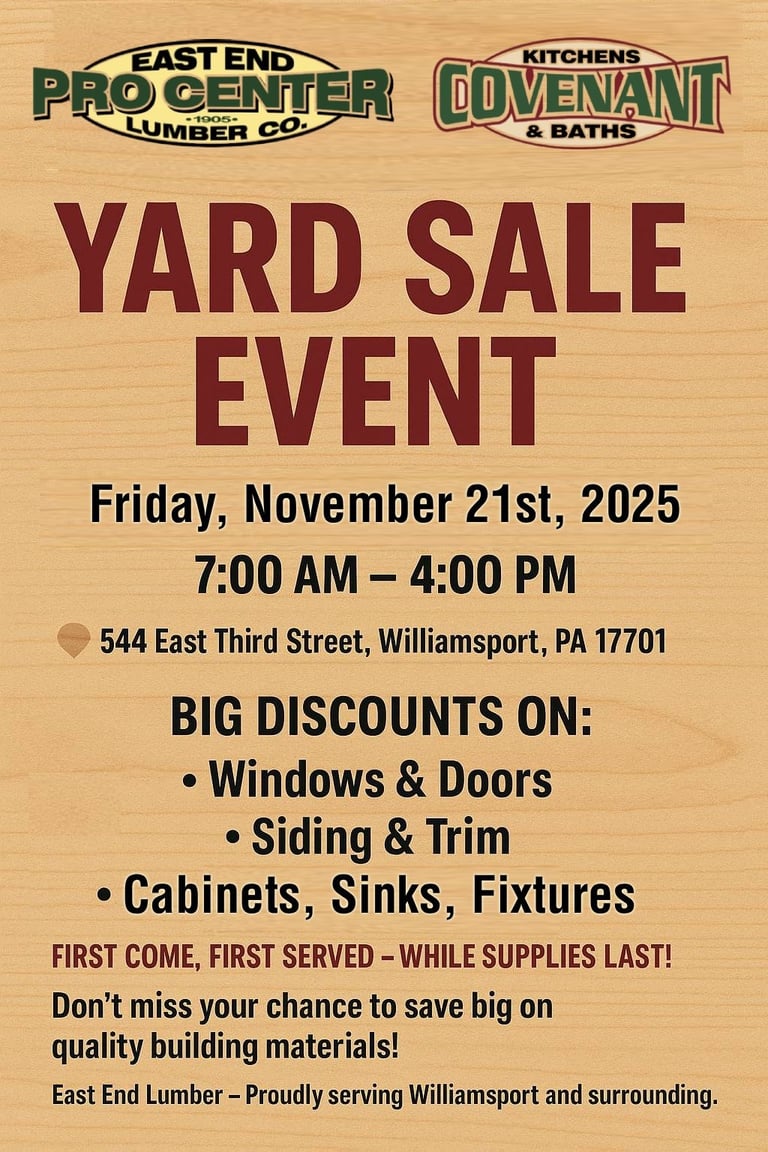 Yard Sale Event! Friday, 11/21 from 7 AM - 4 PM at the East End Pro Center Lumber Company.